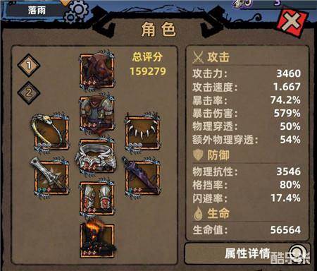 最终面板:攻击3338以上(主手暗杀),攻击4454及以上(主手噬魂者),暴击74.6%,爆伤583%,穿透50%,额外穿54%,物抗2056及以上,格挡73.4%,闪避18%,生命50925及以上,吸血36%。