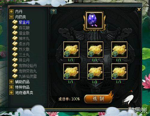 除了宠物内丹之外,石硫磺、云母、木芝、硝石、曾青、戎盐、雄黄、滑石等物品也是《问道》在炼制丹药时极为重要的原材料,不过它们大多都被用于炼制“辅助药品”。如提升宠物下次死亡时复活率的太乙招魂丹、增加宠物怒气的怒火攻心丹、解除自身一个障碍状态的醒神丹、短时提升宠物的速度的风驰丹等。
