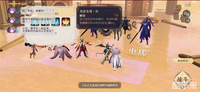 战斗思路大致如下:开局用援护抱朴子群控怪物给小怪触发易伤,4个人群体释放技能清掉小怪、打残主怪,队伍尾速在放技能前用卡门清除离BOSS最近的幻书身上的控制效果,第二轮集火主怪结束战斗。