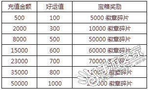 【活动内容】活动期间可通过充值金币获得好运值,积累好运值即可打开宝箱奖励,超多的徽章碎片,徽章等级不断攀升,绝对超值的提升战力资源,尽在特惠好礼。