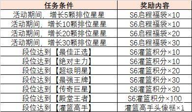 在赛季初,灌篮手游还将开启新赛季的冲刺活动。只要达到指定段位或增长指定排位星星数,即可获得灌篮高手头像框、S6灌篮积分和S6启程福袋。