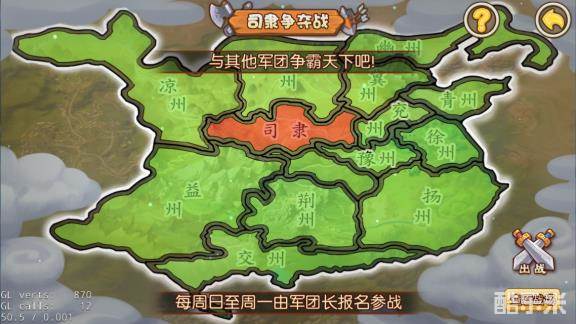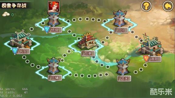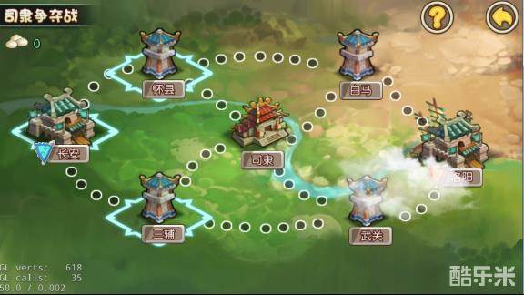 以司隶争夺战的战役地图为例,进入军团战的玩家会分为两个势力。左边的势力从以长安为据点,右边的势力以洛阳为据点,两个据点城市之间有5座城市供玩家争夺。