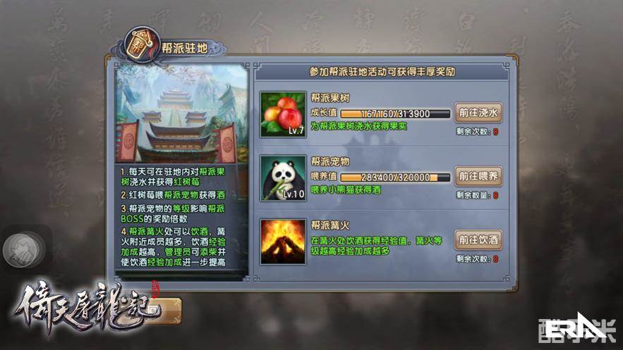 《倚天屠龙记》手游的帮派驻地玩法在满足各位少侠养成癖好的同时,也为大家获取帮贡、帮派资金、帮派资源提供便利。驻地中的帮派果树、帮派宠物、帮派篝火三大玩法各有千秋,互相关联。每天为帮派果树浇水可获得红树莓,得到的红树莓则拿来喂养帮派宠物大熊猫,可以得到浊清酒。这酒不似劲酒,要尽情贪杯噢~建议多积攒浊清酒然后合成“女儿红”,进而合成“屠苏酒”、“兰陵酒”,越高品质的酒喝起来经验加成越高,五坛下来发现自己经验条全绿了有木有!