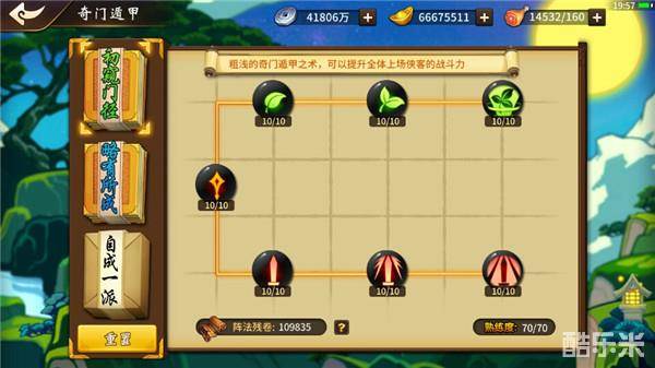 奇门遁甲分为初窥门径、略有所成、自成一派三个境界,由浅入深,学习需要消耗一定的银两和阵法残卷。初窥门径境界主要针对的是上阵侠客的气血和攻击力两个方面;略有所成境界则是针对前后排的侠客进行不同的加强;自成一派境界细化到针对不同类型侠客的属性提升。玩家可根据当前队伍的侧重点,修炼不同的武学,如不满意当前的搭配可以重置,会返还所有阵法残卷和半额的银两。