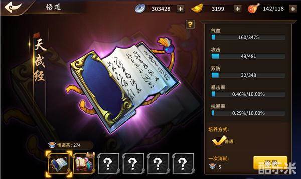 与奇门遁甲不同的是,在悟道玩法中,加成效果对所有侠客同时生效,不作任何区分。目前可领悟的秘籍一共有六部,需要达成一些条件方可解锁。领悟需要消耗一定数量的悟道茶,领悟的结果也都是随机的,并不都是对属性有提升效果,有些甚至会削弱当前属性。所以,如果对领悟结果不满意,可以取消并且恢复到之前的状态。