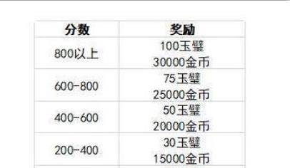 奖励共有5种等级,最高每周可以获得300玉璧,9w金币。获得何种奖励取决于最终分数,划分如下。