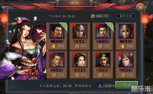 市场:市场属于主城内的固定建筑,当大殿等级达到3级时,水镜先生就会为主公们解锁市场。主公们可以通过消耗信物来换取武将好感度,当好感度到达一定程度时,该武将就会投靠主公。同时,一些与主公有缘的人才将允许各位主公花费元宝直接将其收归帐下。