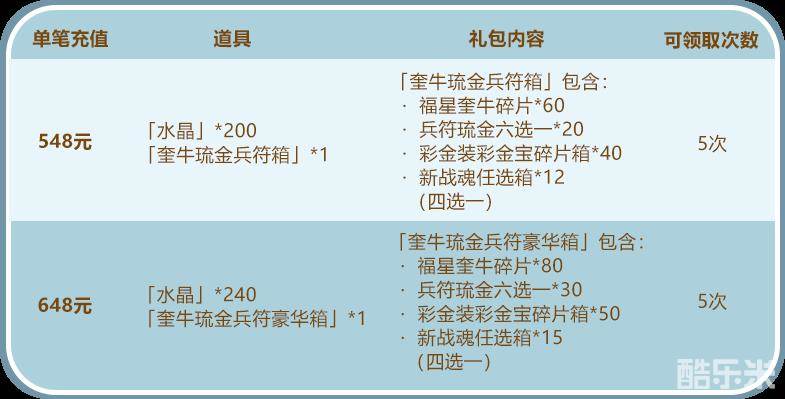 活动规则:在活动期间,7天内任意1天充值548及以上,都能立即激活周基金,领取当前天数所有奖励!7天内可获得如下奖励: