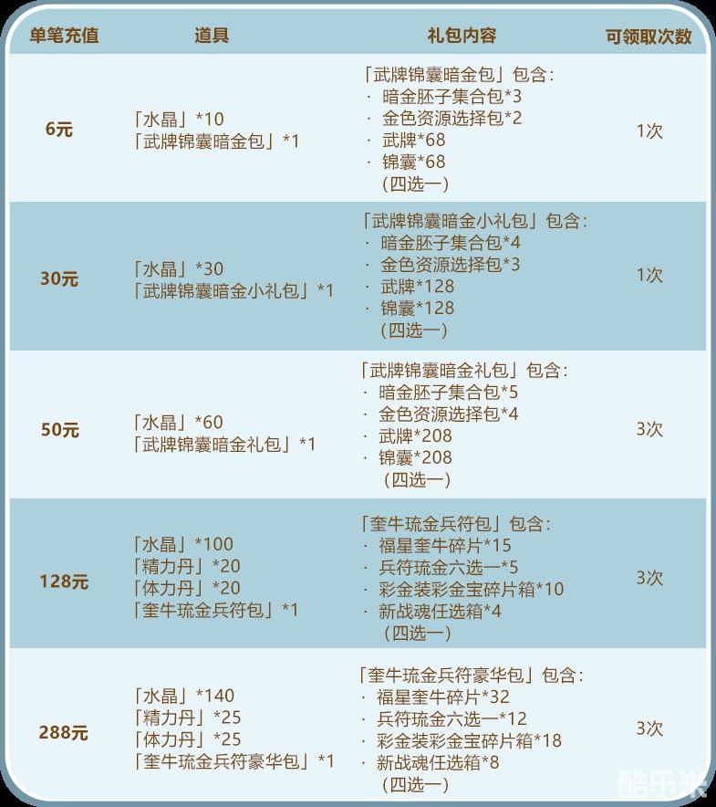 少年们单笔充值指定金额,即可得到福星奎牛碎片、玄女琉金二选一、兵符精华碎片等珍稀资源,少年们千万不要错过哟~