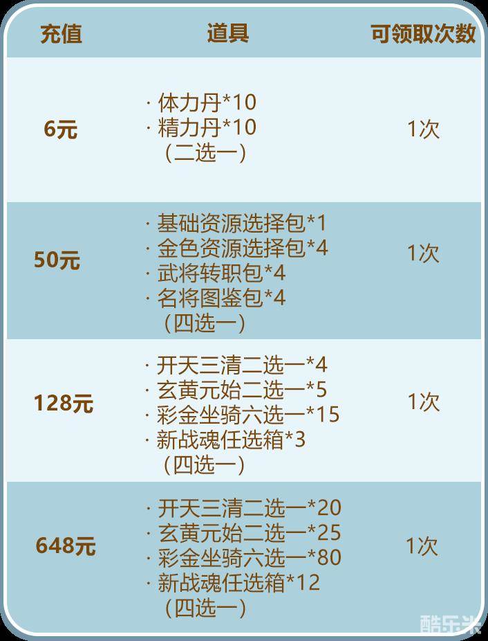 在活动期间,少年们充值将会获得大量珍稀资源,具体奖励如下,少年们可以根据自己缺少的道具来选择档位充值哦~