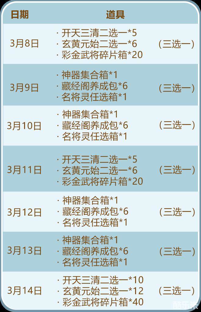 少年们能拿到丰厚的开天三清二选一、玄黄元始二选一、彩金武将碎片箱、神器集合箱、藏经阁养成包、名将灵任选箱等资源哦~