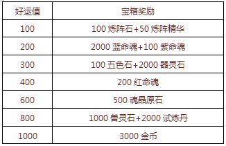 【活动内容】活动期间,每消费1000金币,即可获得100好运值,累计获得好运值可开启奖励宝箱。