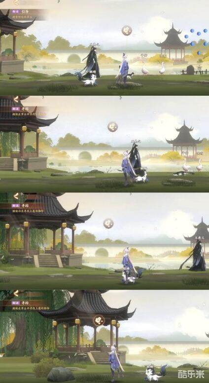①进游戏系统会有提示先向右探寻,走到王羲之身边,石头上会出现鹅食(小小一坨不容易发现)