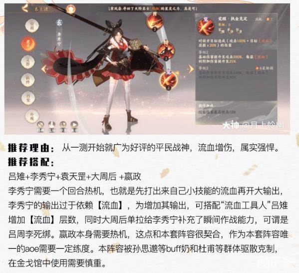 李秀宁是一个非常强力的攻击型名士,可以增加自身伤害,给对手添加流血BUFF。