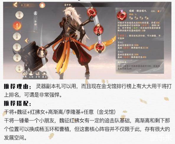 干将比较适合灵器副本礼,在金戈馆使用也比较好。