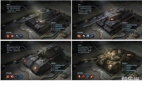 《闪电突袭》主打二战坦克战,其首要明星自然是各式坦克。游戏中装载了包括德国虎式、德国鼠式、德国豹式、苏制T-34等二战经典坦克,重现二战时代钢铁雄师的雄姿。