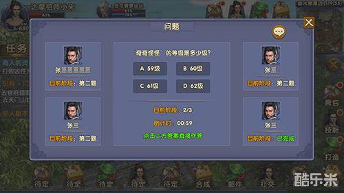 必须结义关系内的所有玩家去“关帝庙”接取任务,接取任务后,会弹出答题界面,题目为3道题。所有玩家需完成3道题且全部正确则完成本轮考验。