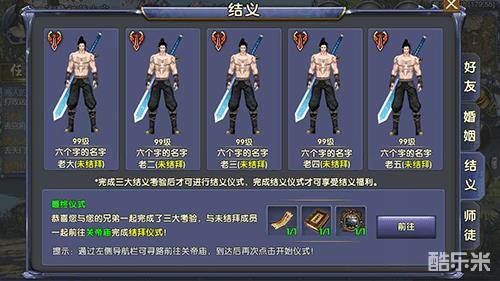 所有考验完成后,所有玩家进入考验完成界面且同时导航栏出现结义相关操作引导。按照指引操作完成结义仪式。