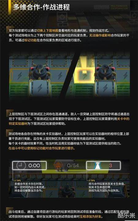 如果有敌人突破了上层玩家的防御层,来到通道后就会出现在下层玩家的地方,下层测试玩家需要防守目标生命,上层玩家这时候除了光看着还可以利用关卡特定实验器材为下层测试区玩家提供帮助。这些器材需要上层玩家的干员进行充能,推测应该是眩晕敌人、治疗干员之类的机制。