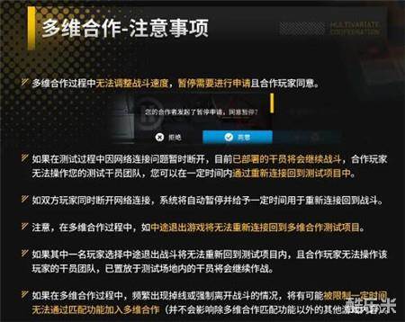 最后再说明一下注意事项,多维合作无法调整战斗速度,暂停需要进行申请且合作玩家同意才行(这让很多上干员和释放技能都要暂停的玩家很难受)。除此之外,中途退出游戏将无法重新连接回到多维合作测试项目,但是你布置的干员会继续作战!频繁出现掉线或者强制离开战斗的玩家可能会被限制一定时间无法通过匹配功能加入多维合作,这个是为了防止捣乱的。