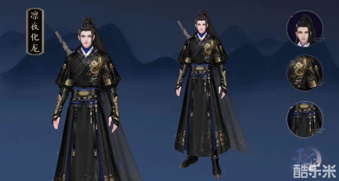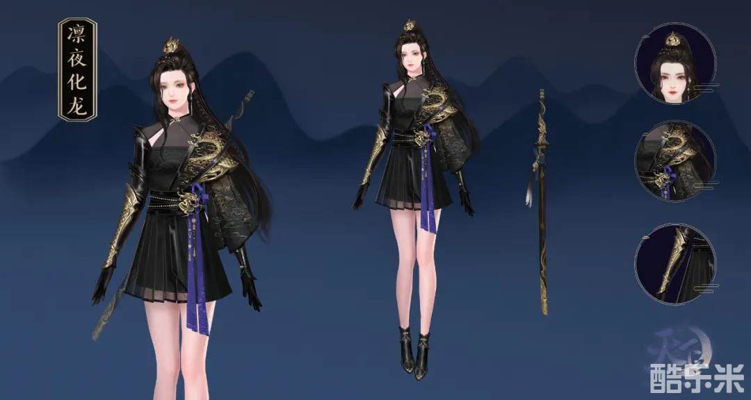 斯须九重真龙出,一洗万古凡马空。珍品时装·凛夜化龙的男装,一袭帅气的黑衣,如蛟龙降世般气势磅礴,黑色锦衣上盘踞着金色精美的龙腾,手臂和腰间配上纯金的配饰,背饰乌雀鸣泓也是精美十足,自有气凌云天的超凡气质。凛夜化龙的女装风格又美又飒,炫酷又略带性感的黑色裙装,金丝绣出的龙腾丰富了色调,锁骨处是半透的黑纱,腰间配以金色腰带束腰,高高束起的马尾随射箭轻轻甩动,箭弓焕发出金色的光芒,赋予角色一种当仁不让的花木兰气魄。