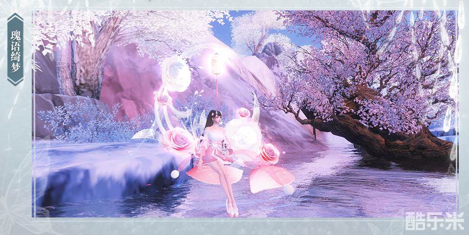 坐骑·瑰语绮梦的整体色调以年轻活力的粉、白色为主,周围环绕着晶莹剔透的白玫瑰和梦幻的粉玫瑰,看起来更多几分仙气。