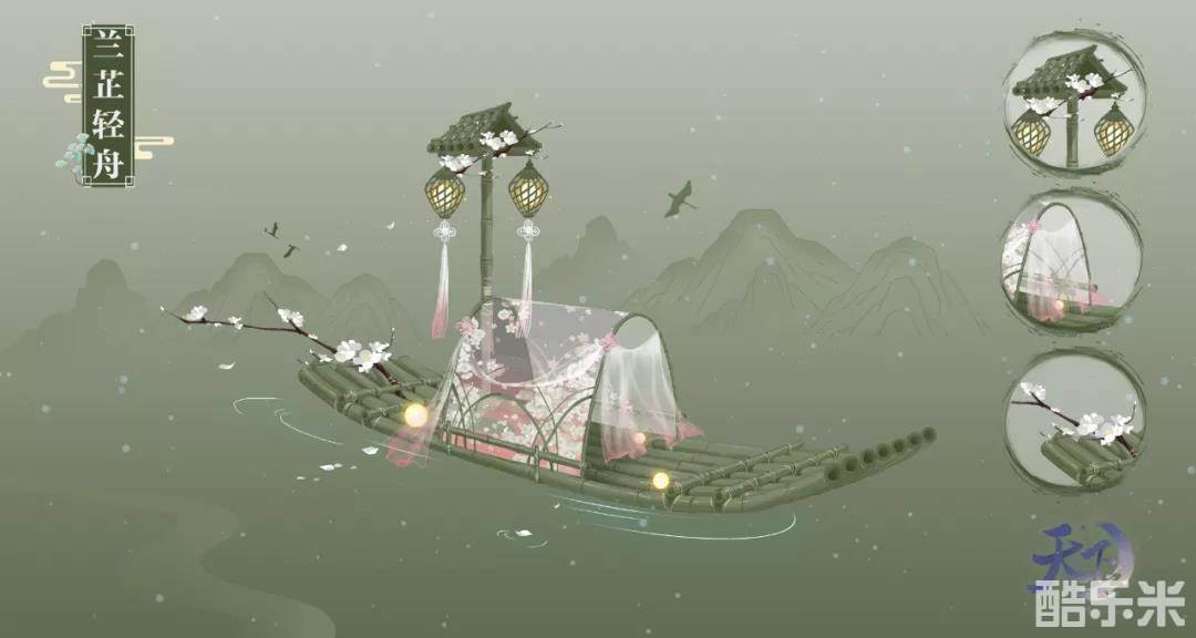 一幅云蓝一叶舟,隔江山色镜中收。兰芷轻舟以翠绿色作为轻舟主体色调,舟上立着两个精致的镂空灯笼,从中散发点点光芒,透明的薄纱营造出诗意朦胧的氛围,整体风格高洁古典。一叶轻舟,摇曳于江上,坐拥一番美轮美奂的国风美景。