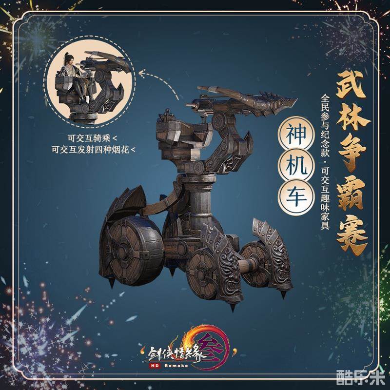 本次“武林争霸赛”诚邀广大侠士参与其中,共同品味攻城略地的热血激昂!参赛后获胜1场,每位参赛侠士即可获得1颗绑定版【五行石(八级)】、10枚【战意江湖符】及10,000威望奖励,通过邮件发放。而参与4场比赛后,每位参赛侠士即可获得1个【武林争霸赛专属纪念称号】、1个【争雄宝箱】、1件【遗失的美好】,以及1件纪念款可交互趣味家具【神机车】,同样通过邮件发放。这件全民参与纪念款的可交互趣味家具【神机车】以侠士们熟知的攻防战载具为原型打造,安置家中尽显威武霸气!不仅如此,侠士们还可与之进行交互骑乘,并可发射四种不同的烟花,趣味十足!