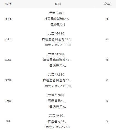 活动期间,神兽特惠礼包限时上架,内含不同档位的超值礼包,包括神兽灵魄自选箱(从所有神兽灵魄中中任选其一)、神兽血脉自选箱(从所有血脉石中任选其一)等,助力少年征战九州。
