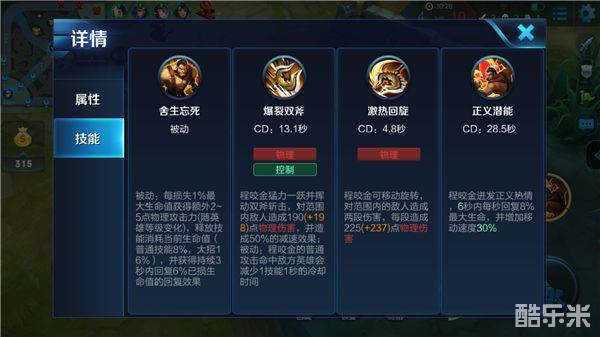 程咬金的攻击力和程咬金的血量损失多少有关,生命值损失越多,攻击力就越高,也就是说程咬金残血时的攻击力要比满血时的攻击力高。