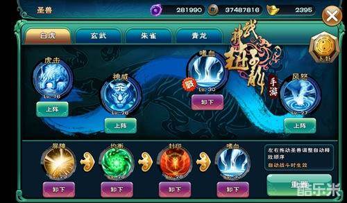 《武神赵子龙》手游中的白虎、玄武、朱雀、青龙4种圣兽每种都有4个技能选择,每种技能附带的属性不一样,各位小伙伴可根据具体对战情况做适当调整,以此来获得更高效的战斗成绩。每个圣兽都有4中技能且都可以养成升级,以此来提升其附加的属性。另外在圣兽系统界面里可以左右拖动圣兽来调整上阵顺序,默认效果为从左往右,自动战斗时将会生效释放强大技能。