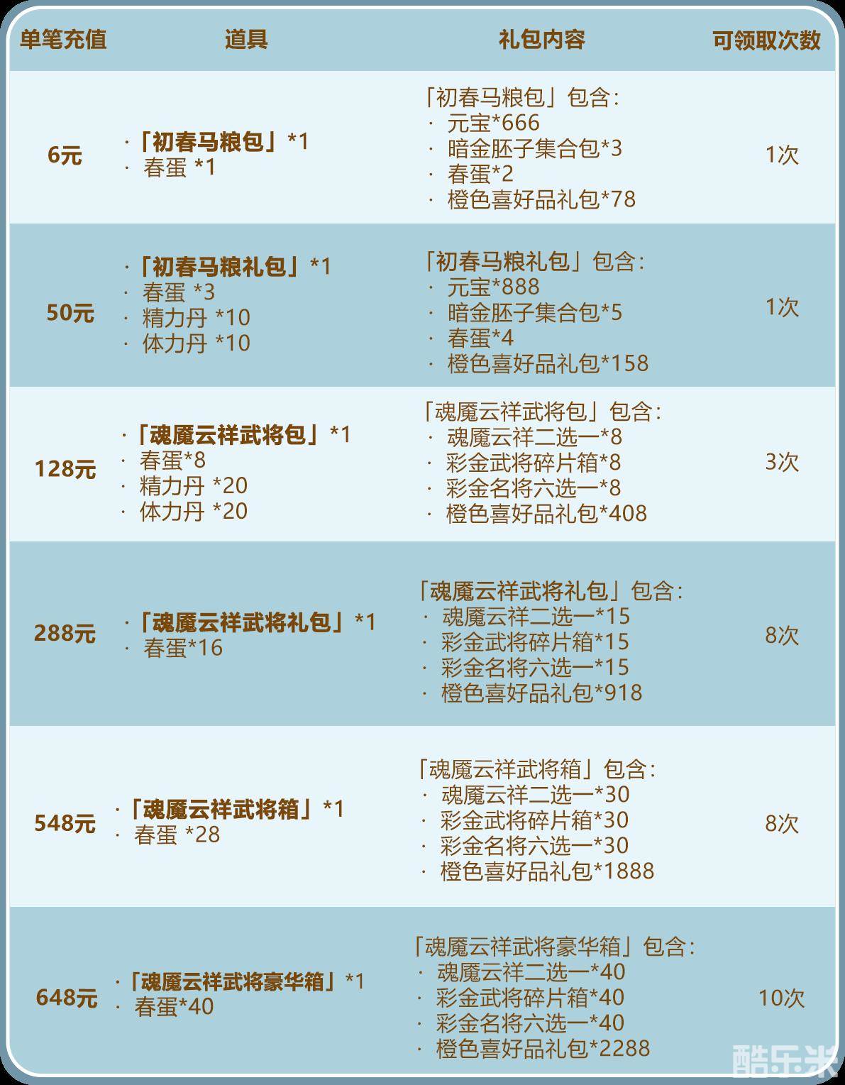 3.「初春礼盒」可开出:初春随机字卡包*111、玄阵养成包*50、觉醒丹*888、天命石*888、极品精炼石*888、安魂石*666、军师列阵包*40、名将图鉴包*40、宝物精炼石*888、初春随机字卡包*6、玄阵养成包*5、觉醒丹*100、天命石*100、极品精炼石*22、安魂石*11、军师列阵包*1、名将图鉴包*1、宝物精炼石*60中的随机1种。