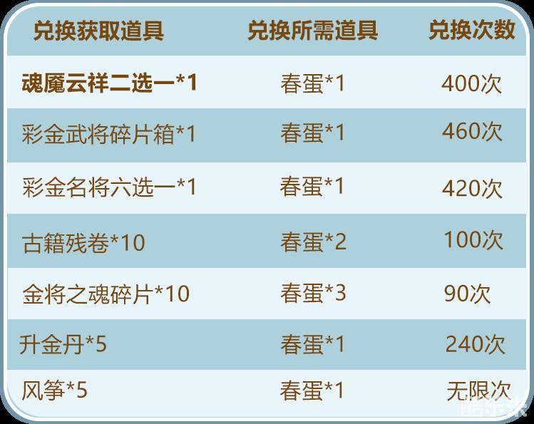 「春蛋」可用来兑换魂魇云祥二选一、彩金武将碎片箱等稀有资源:
