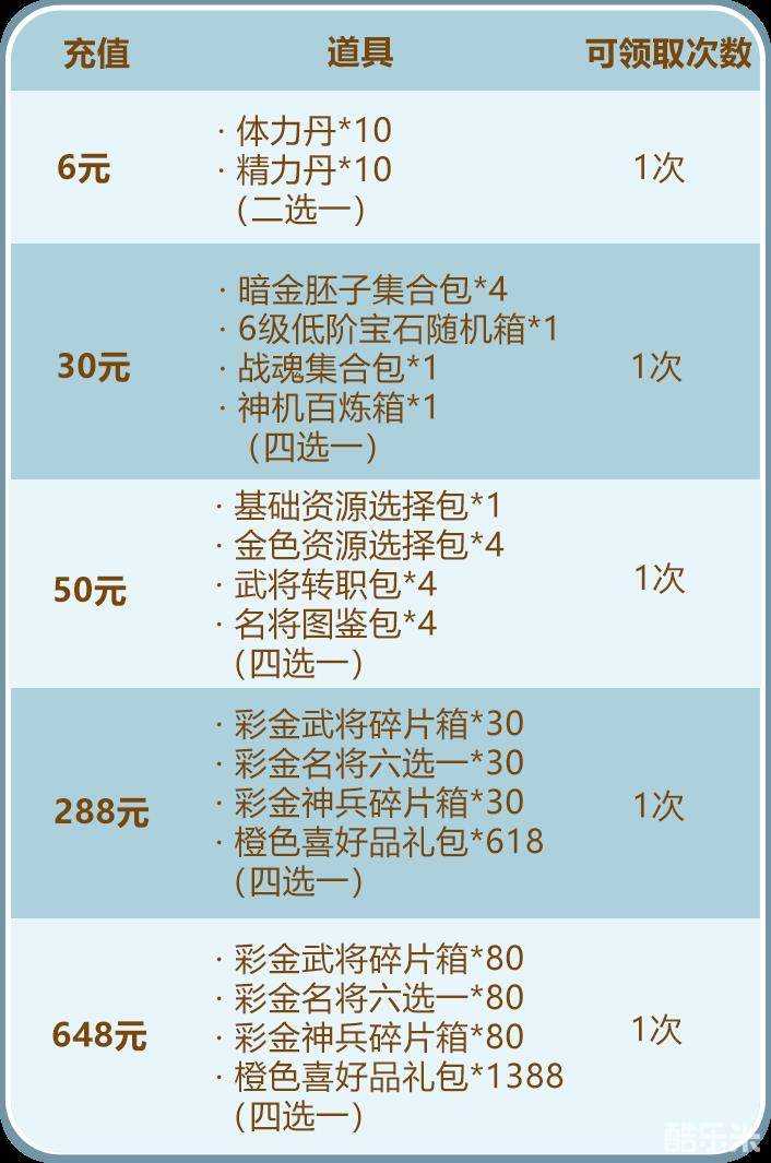 在活动期间少年们单笔充值至指定金额,即可获得魂魇云祥二选一、彩金武将碎片箱、彩金名将六选一、橙色喜好品礼包、春蛋等资源:
