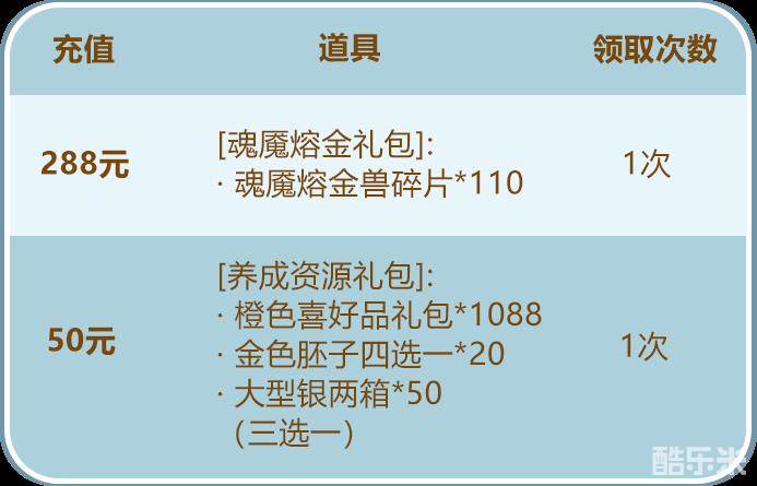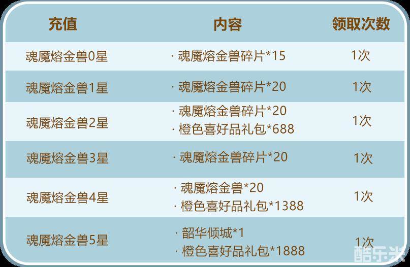 少年们单笔充值指定金额,即可得到魂魇熔金兽碎片及丰厚的养成资源!少年们千万不要错过哟~
