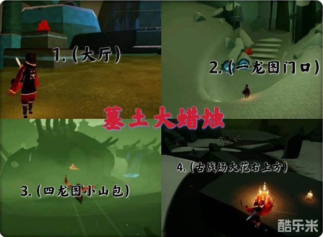 4、最后一个大蜡烛在墓土三龙图(远古战场)大花右前方的一个平台上。