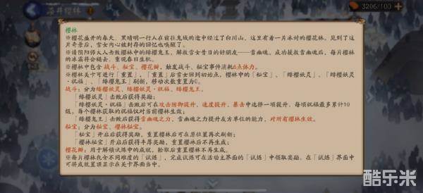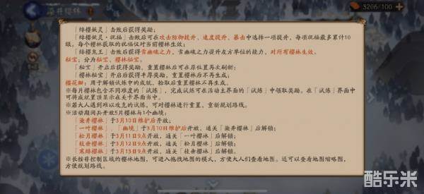 「樱林秘宝」开启后获得丰厚奖励,重置樱林后不再生成;