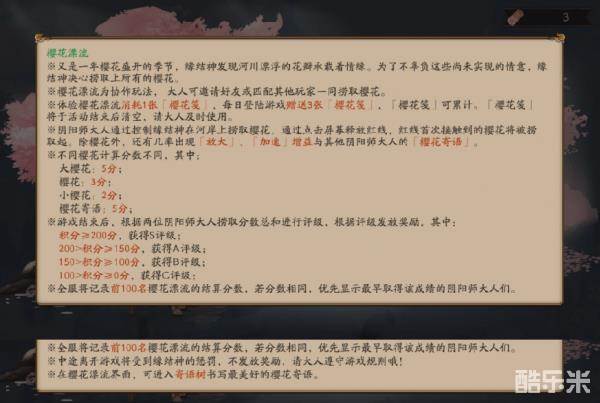 ※全服将记录前100名樱花漂流的结算分数,若分数相同,优先显示最早取得该成绩的阴阳师大人们。
