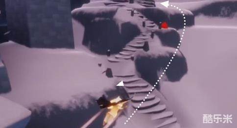 1、第一个光之翼我们可以来到我们刚进入梦想季的地方,在一个三角形的房子后面的山坡上,慢慢爬上去,山坡的位置如图所示,在上面的山洞里面就能够找到这个小金人了。