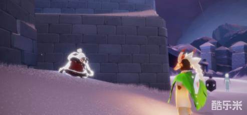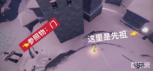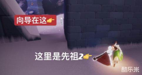 我们顺着滑到下来就能够来到梦想季的新图圆梦村,在圆梦村入口的位置就能够看到季节向导先祖,然后我们以季节向导先祖为参照物,这位转圈圈动作先祖就在如图所示的墙角处,大家过来触碰之后即可完成点亮先祖。