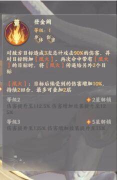 提升至满级之后对敌方造成3次总计攻击135%的伤害,并对目标附加[凰火],再次命中[凰火]目标时,将[凰火]传递给另外两个目标。而[凰火]是造成额外伤害,持续两回合,叠加2层。