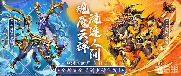 三国热血巨作《少年三国志》全新玄金双骑魂魇熔金兽、云祥蛟龙驹今日正式登场。两大神兽加入三国战场,大幅提升玄金坐骑各技能伤害系数,带来更高的威胁。搭配额外的玄金天赋,玄金双骑将提供巨额攻防属性,大幅提升武将与名将的强度,为少年们阵营增添强大战力。