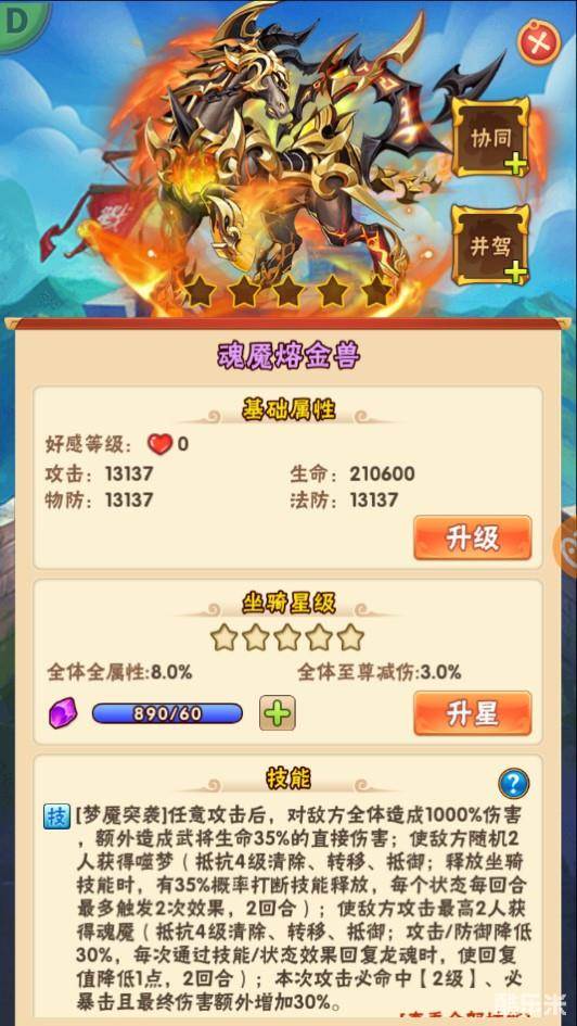 魂魇熔金兽的技能大招“梦魇突袭”可对敌方全体造成大量伤害,同时封锁敌方坐骑技能触发,在武将局提供稳定的坐骑限制手段。此外,该技能还可以从根本上遏制当前庞大的龙魂恢复量,加重对手武将与名将龙魂不足的后顾之忧。总体来说,凭借其全面的防御属性,魂魇熔金兽能提供全额防护措施,大大提升阵容整体坦度。