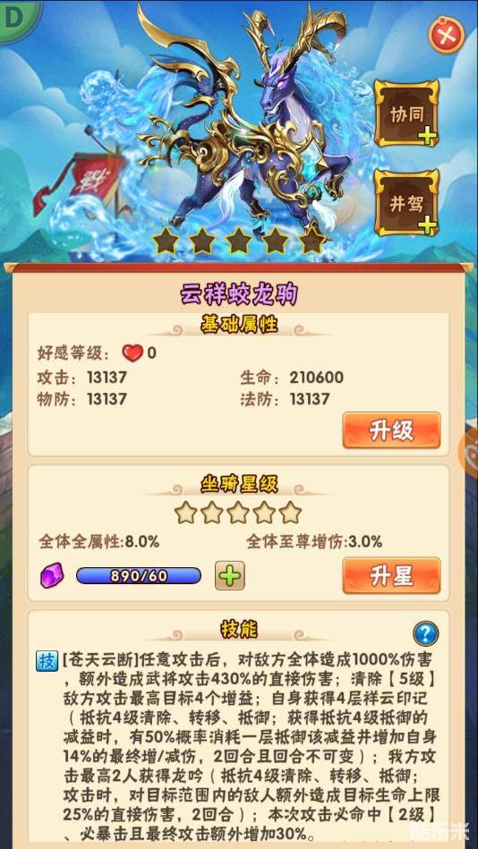 作为攻防一体的优质主力坐骑,玄金坐骑云祥蛟龙驹的技能“苍天云断“可在增强我方减益的同时,最大化遏制敌方增益;此消彼长之间拉开敌我双方差距,实现先发制人。另外,云祥蛟龙驹还拥有全新的反击机制,此机制将坐骑的强度又提升了一个台阶。总体而言,云祥蛟龙驹具备优质的BUF差体系与极佳的道具兼容性,属于伤害突出的主力坐骑。