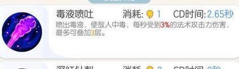 毒液喷吐,(消耗1,CD2秒):喷出毒液,使敌人中毒,每秒受到3%的法术攻击力伤害,最多可叠加3层。