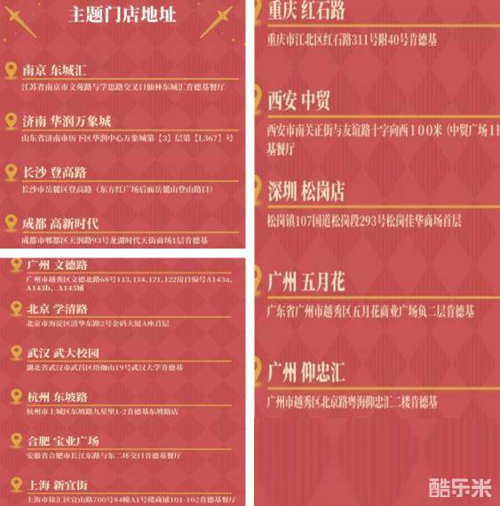 这个活动绝大多数肯德基店铺都能参加,也就是大部分城市的kfc都能买到相关套餐,在3月8日-3月21日通过线上途径购买指定套餐(外卖/自提均可),就能获得1份兑换码。但是想要领取周边只能前往主题店铺,在下面为大家附上各地的主题店位置介绍。