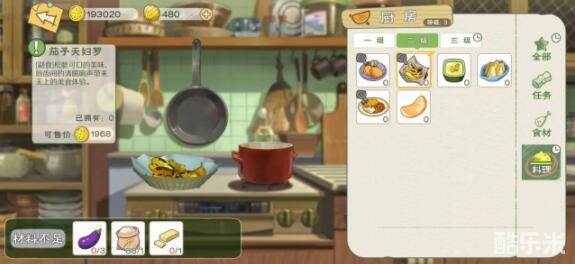 料理是前期来钱比较快的一个方法,而料理的售价是和料理等级有关的,刚开始建议大家通过制作大量薯条来刷料理等级,然后偶去做主线升级厨房等级,这样有了足够的茄子和牛奶,制作茄子天妇罗后就能在前期小赚一笔了。