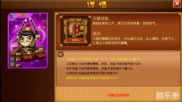 在君主奋斗杀敌之际,刘备的天赋技能可以大幅度提升友军的怒气回复,君主不妨设身处地的想象一样,当两方同时开始作战时,您会比对方率先释放英雄的天赋技能, 那对敌方的杀伤一定会大幅提高的!还在等什么,快快来收集他吧!
