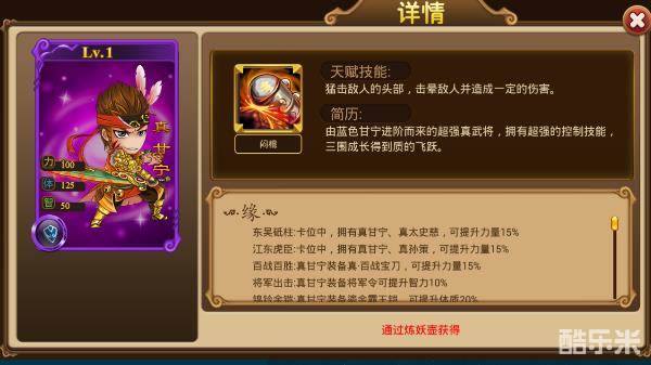 东吴砥柱:卡位中,拥有真甘宁,真太史慈,可提升力量15%;