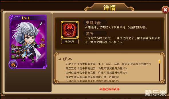金枪神将:马超装备虎头皂金枪可激活技能真丶吸血光环。